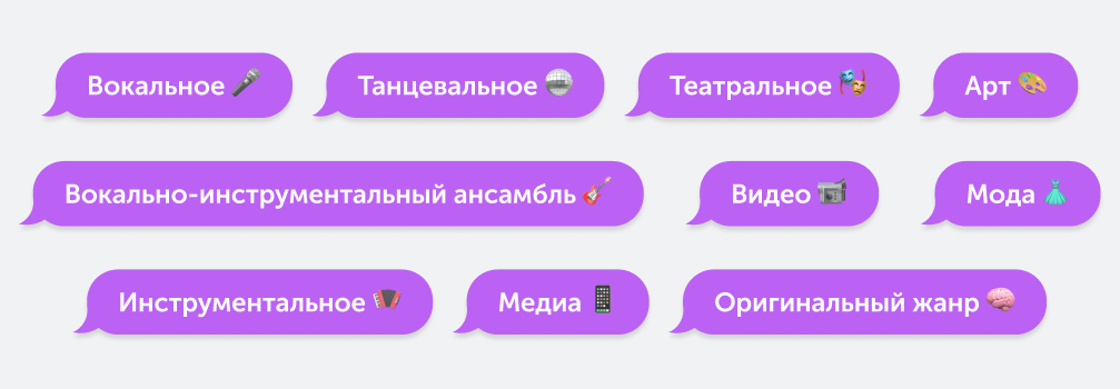 17 февраля — вокальное, инструментальное, направления и вокально-инструментальный ансамбль 19 февраля — танцевальное направление и мода 20 февраля — оригинальный жанр и театральное направление. |